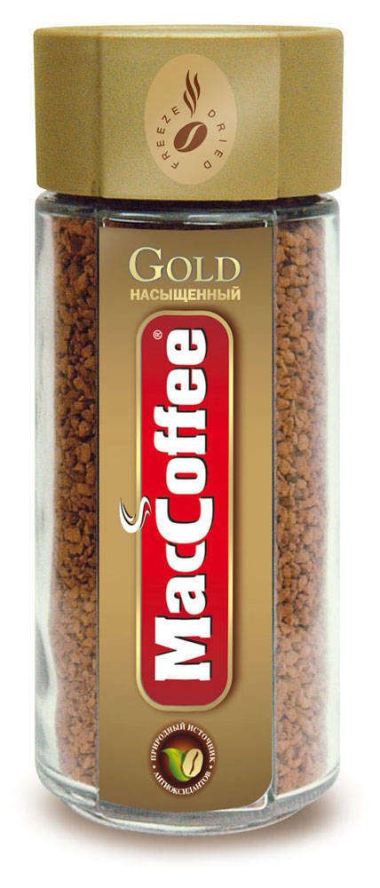 Кофе натуральный MacCoffee Gold растворимый сублимированный 100г. Кофе натуральный растворимый сублимированный MacCoffee Gold, в стеклянной банке. MacCoffee Gold - 100% сублимированный кофе с богатым, насыщенным вкусом и ярким ароматом, который неоспоримо отличается от других. Роскошный вкус MacCoffee Gold дарит незабываемые минуты наслаждения, заряжая живительной энергией и бодростью.