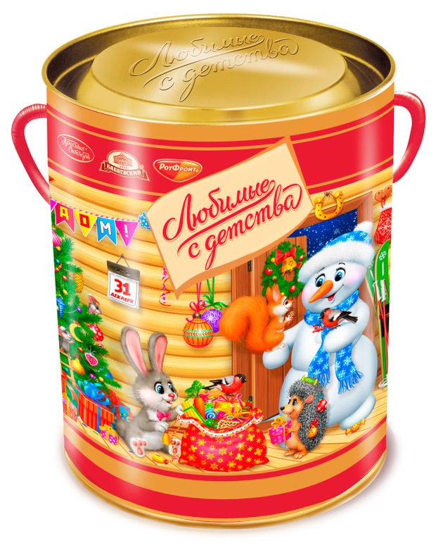 Компактная туба с жестяной крышкой, стилизованная под новогодние подарки 50-х годов. Любимые с детства конфеты легендарных российских фабрик – отличный вариант подарка как для детей, так и для взрослых.