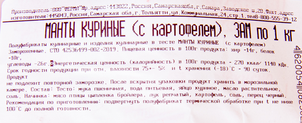 МАНТЫ КУРИНЫЕ ( С КАРТОФЕЛЕМ) , ПАКЕТ 1 КГ, ЗАМ.ФЕРМА