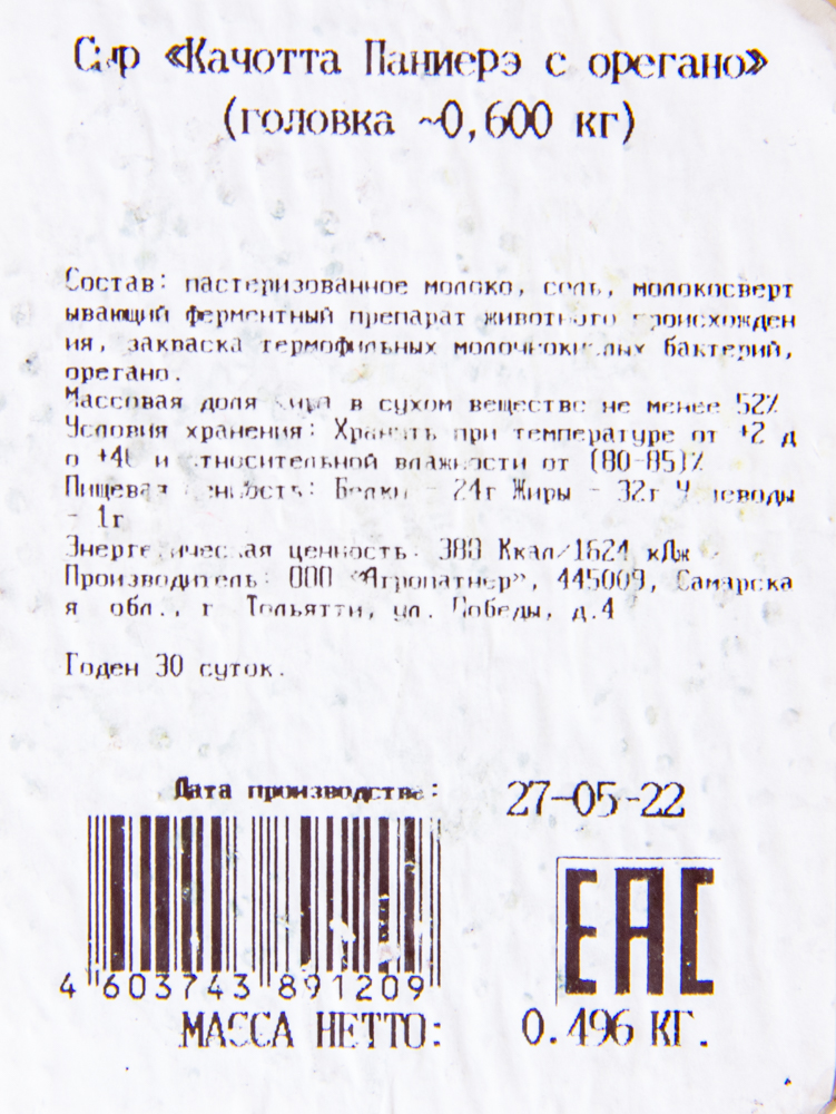 СЫР КАЧОТТА ПАНИЕРЭ С ОРЕГАНО 200ГР