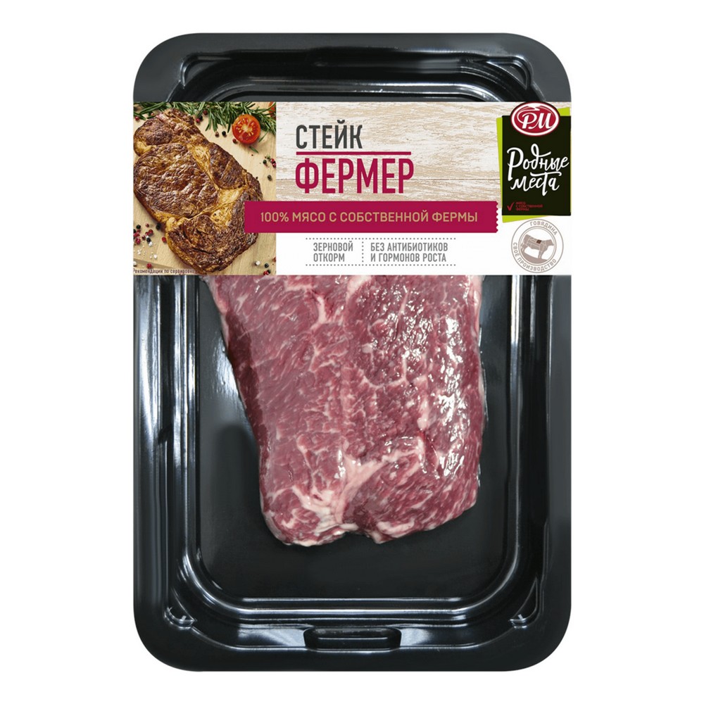 Стейк из говядины РОДНЫЕ МЕСТА Фермер подходит как для жарки на сковороде-гриль, так и на решетке мангала. После приготовления мясо получается сочным и нежным. Готовое блюдо оптимально сочетается со свежими овощами, зеленью, салатами и разнообразными соусами.