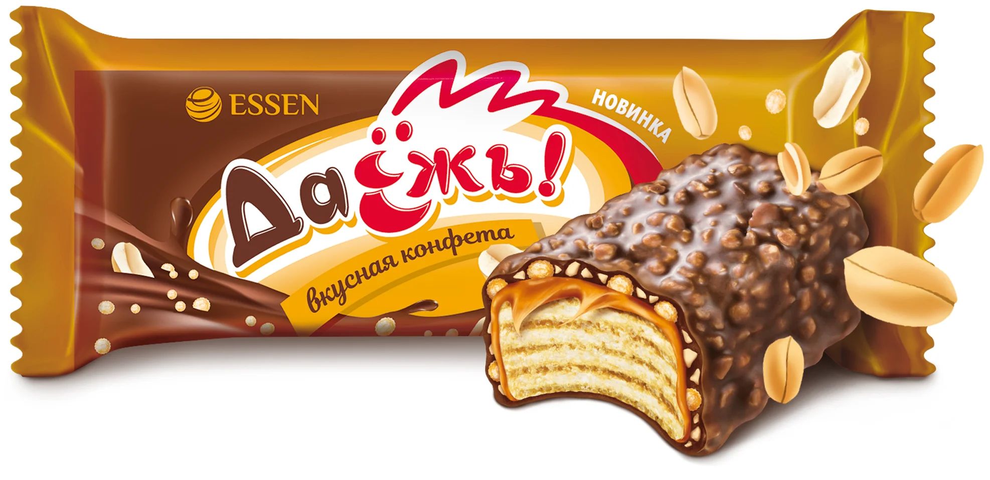 Укрупненные конфеты, состоящие из хрустящих вафель, нежной начинки со вкусом арахиса, покрытые мягкой карамелью, дробленным арахисом и криспи.