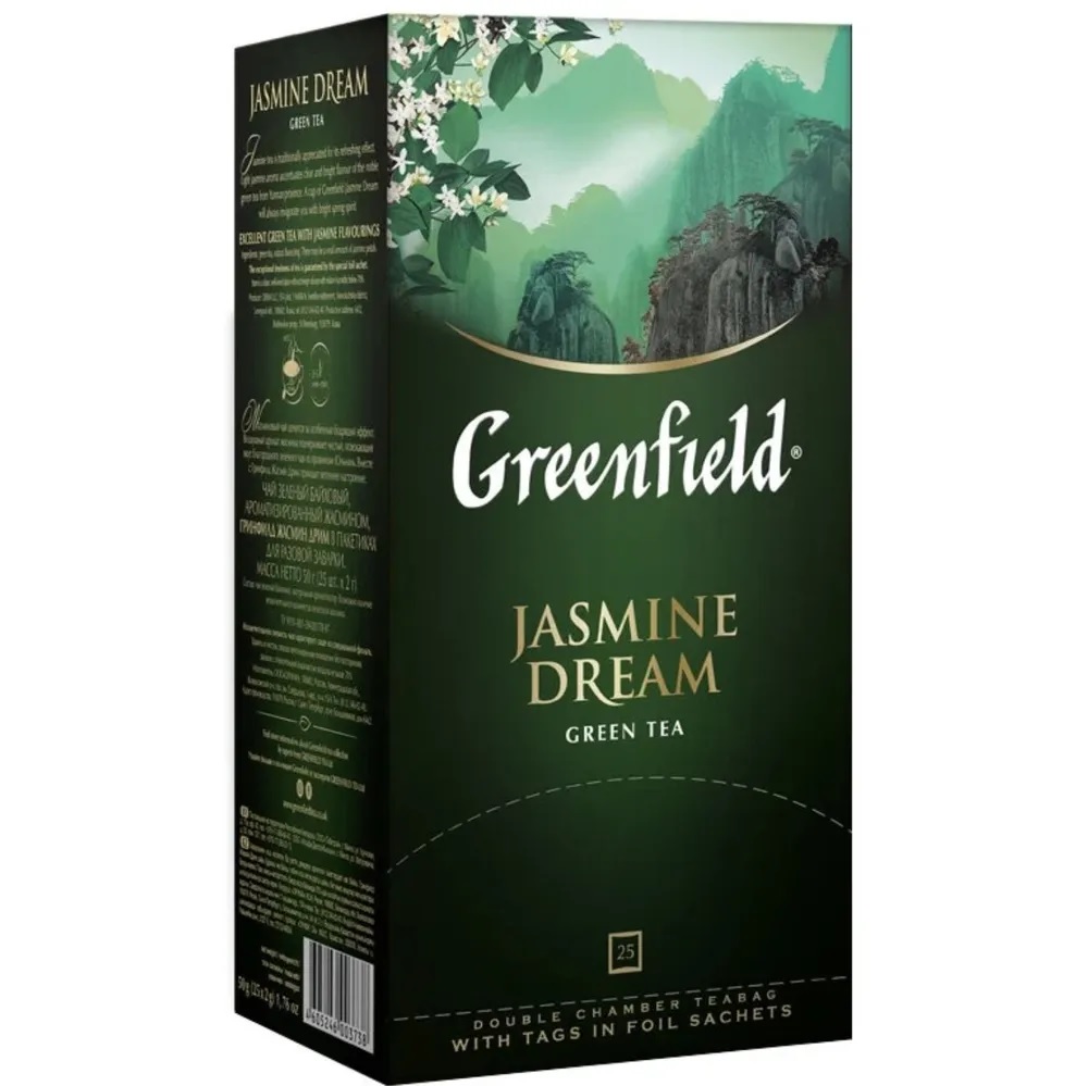Зеленый чай в пакетиках Greenfield Jasmin Dream - это купаж чая с плантаций Юньнань и цветов белого жасмина. Воздушный цветочный аромат подчеркивает чистый освежающий вкус чая. Напиток богат антиоксидантами и витаминами В, С, РР, которые отвечают за молодость кожи и волос, повышают иммунитет.
