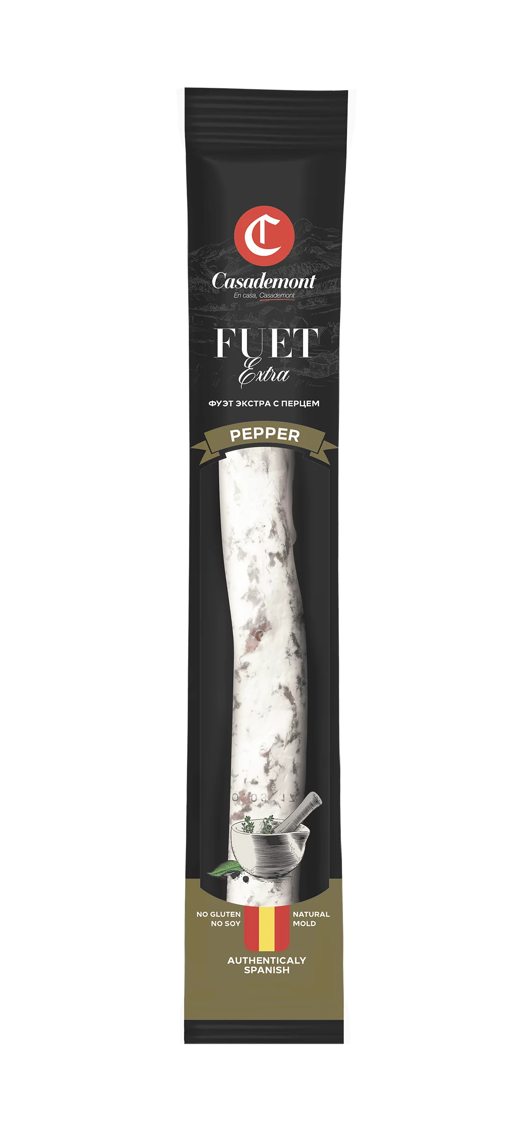 Колбаса сыровяленая CASADEMONT Фуэт c перцем Экстра полусухая производится из отборной свинины и нежного шпика. Оптимальная эластичность, красивый узор среза и нежный аромат перца делает продукт идеальным дополнением для любой трапезы.