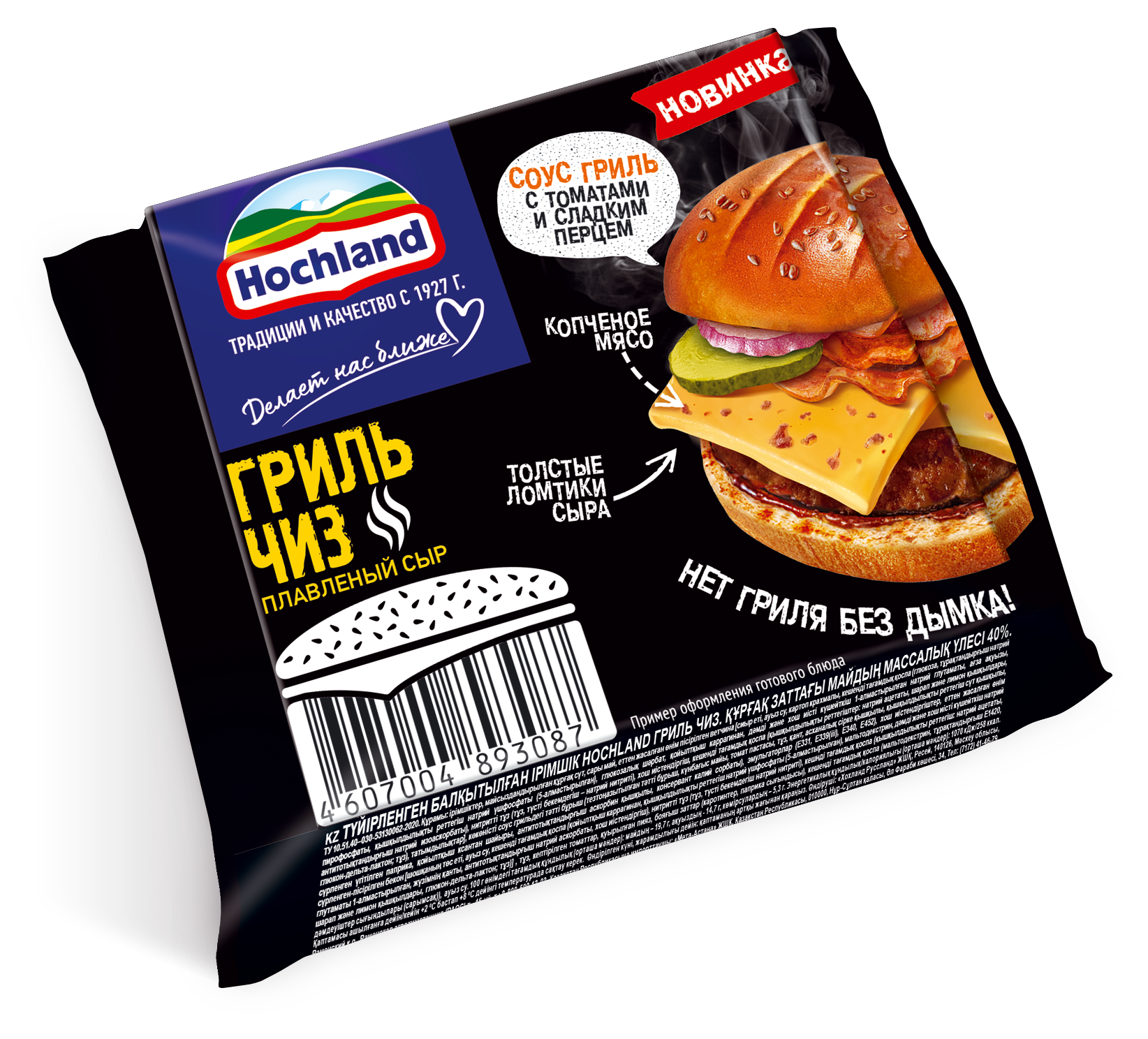 Сыр плавленый ломтевой Hochland Гриль Чиз. Массовая доля жира в сухом веществе 40% ТУ 10.51.40–030-53130062-2020. Яркая и стильная новинка от Hochland - с дымком костра!