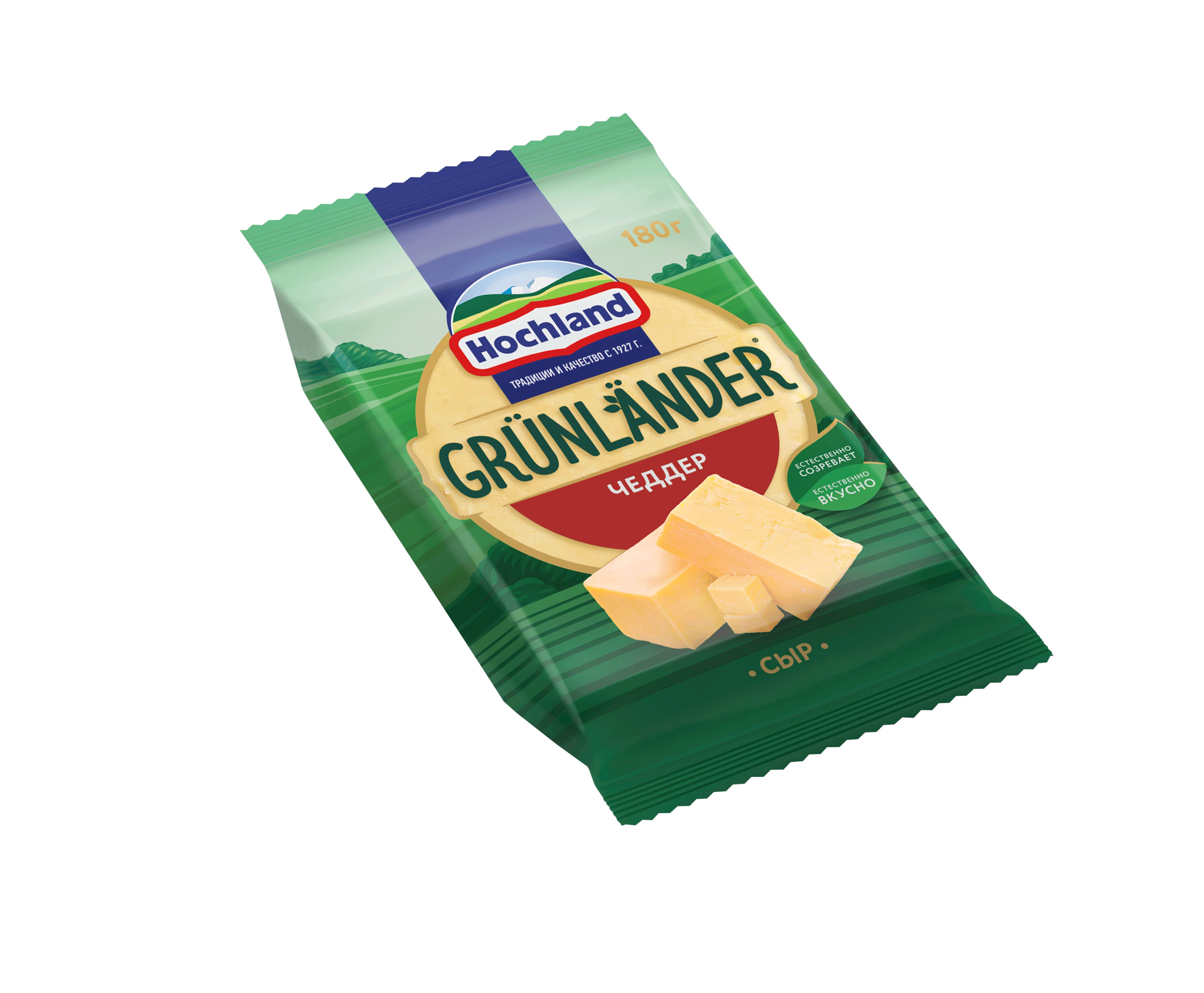 Сыр фасованный полутвердый Чеддер. Массовая доля жира в сухом веществе 50 %. ТУ 10.51.40-001-58733842-2016. Grünländer "Чеддер " яркий молочный вкус для особых моментов. Производится по особой рецептуре по заказу компании Hochland из отборных ингредиентов по технологии естественного созревания без добавления консервантов и красителей. Естественно созревает - естественно вкусно!