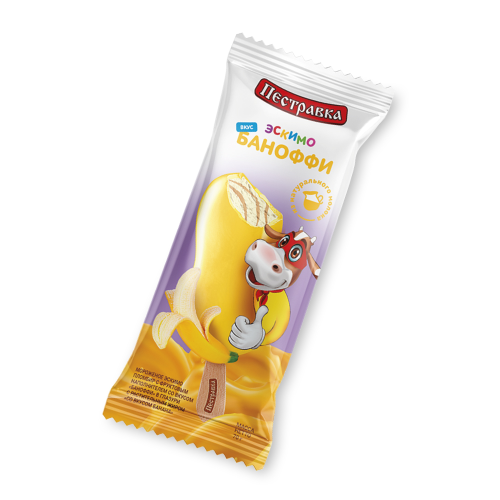 Мороженое эскимо пломбир с фруктовым наполнителем со вкусом «Баноффи» в глазури с растительным жиром «со вкусом Банана». Новинки от Пестравки с яркими и насыщенными вкусами не оставят равнодушными ни детей ни взрослых.