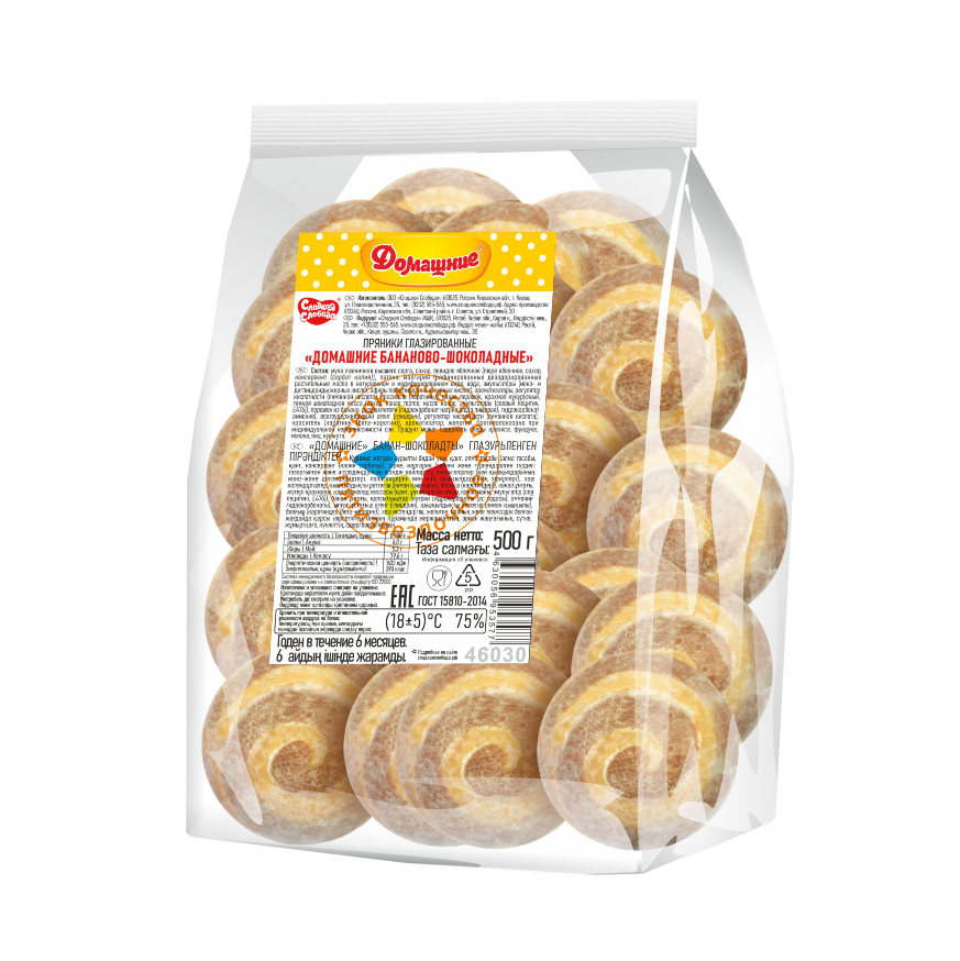 Нежные, ароматные пряники с двойным вкусом банана и шоколада. Выпекаются по ГОСТ с использованием лучших ингредиентов: муки высшего сорта, яблочного пюре, куриного яйца, шоколада. Прянички украшены оригинальным двухцветным рисунком в виде спирали.