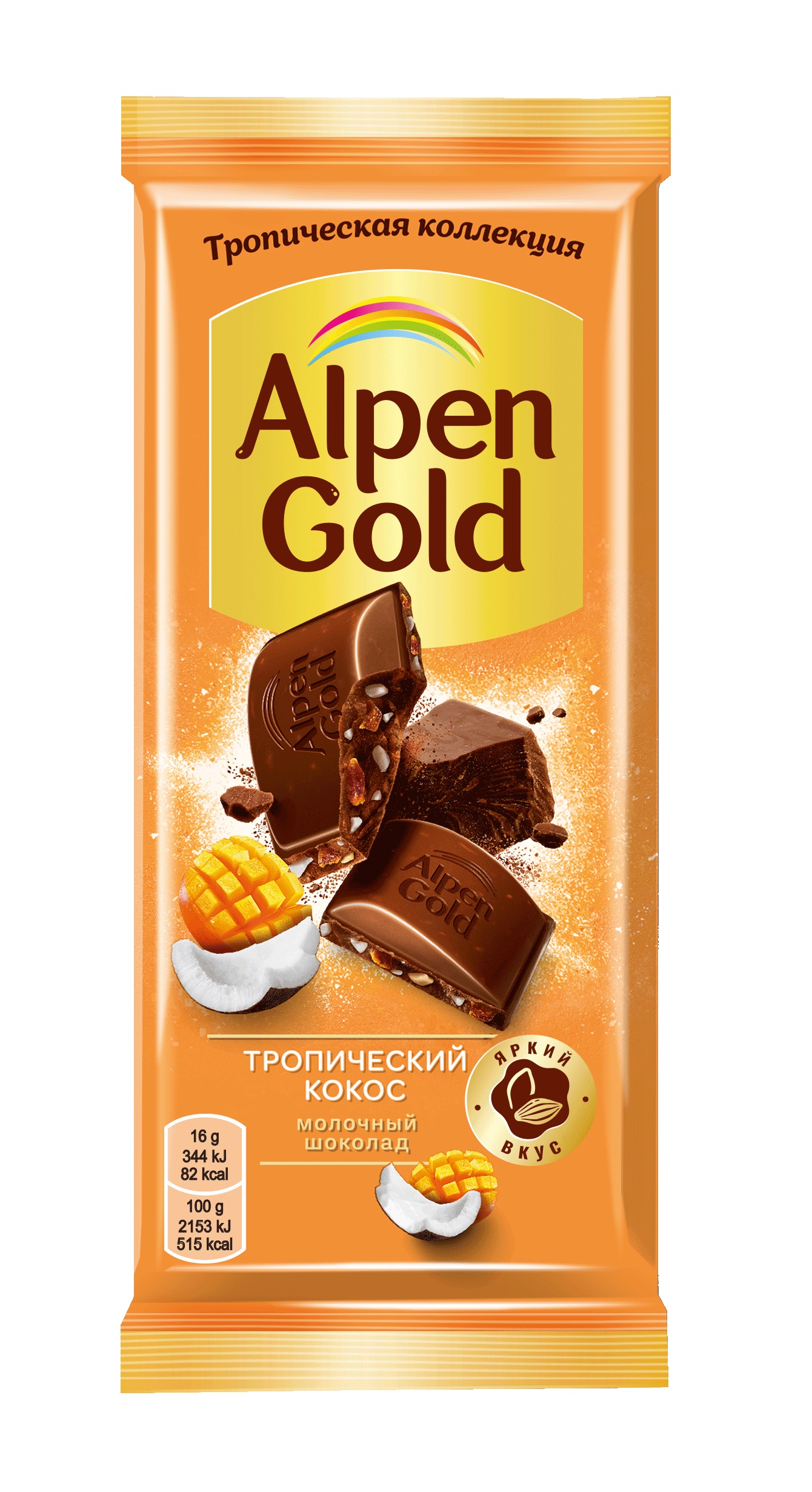 ШОКОЛАД АЛЬПЕН ГОЛЬД МОЛОЧНЫЙ ТРОПИЧЕСКИЙ КОКОС С ФРУК. КУСОЧ. СО ВКУСОМ МАНГО, АНАНАСА, МАРАКУЙИ, С КОКОСОВОЙ СТРУЖКОЙ И ВОЗДУШНЫМ РИСОМ 80 Г