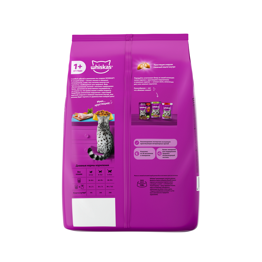 Это сбалансированный рацион для здоровой и счастливой жизни Вашей кошки. Хрустящие подушечки с нежным паштетом внутри обязательно придутся по вкусу Вашей любимице. Кроме того, Whiskas® содержит все необходимое, чтобы еда Вашей кошки была не только вкусной, но и полезной. Whiskas® это: