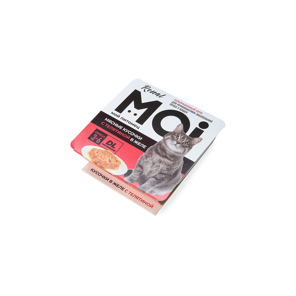 КОРМ MOI ДЛЯ КОШЕК МЯСНЫЕ КУСОЧКИ С ТЕЛЯТИНОЙ В ЖЕЛЕ, ПРОФИЛАКТИКА ЗАБОЛЕВАНИЯ ПОЧЕК ЛАМИСТЕР 100 ГР