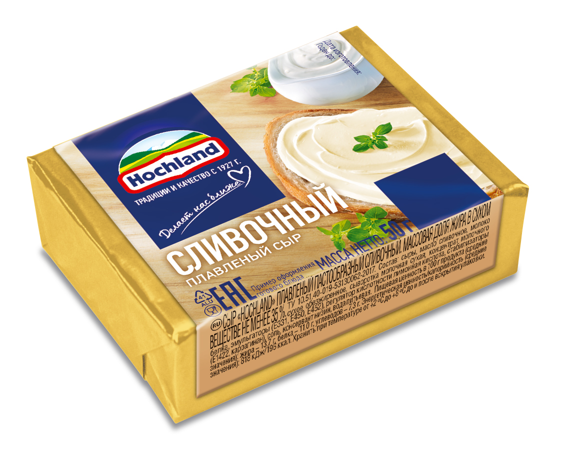 Плавленый сыр Hochland Сливочный в фольге – классический формат упаковки, который знаком всем с детства. Блочок плавленого сыра Hochland отличается своей универсальностью – его одинаково удобно использовать как в качестве снека или намазки для бутерброда, так и для кулинарии. Нежный сливочный вкус плавленого сыра Hochland станет прекрасным дополнением к любому блюду.