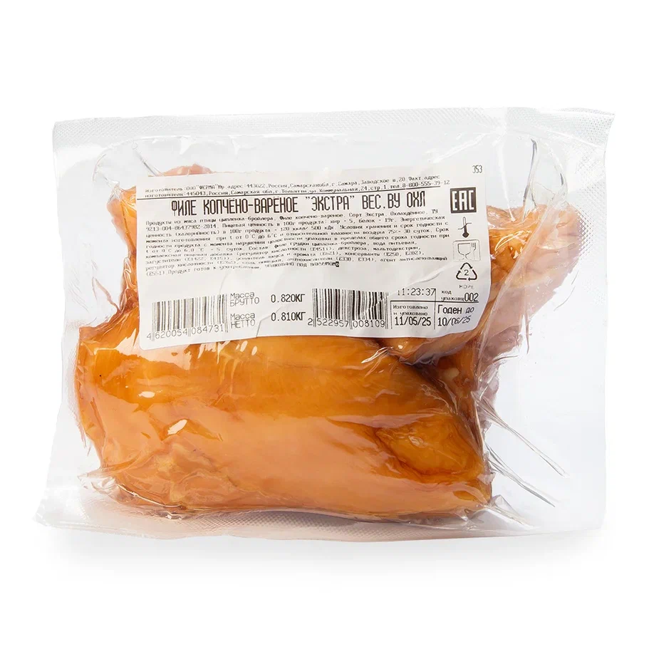 Продукт из мяса птицы (цыпленка бройлера) копчено -вареный . Сорт Экстра - Филе грудки куриной .