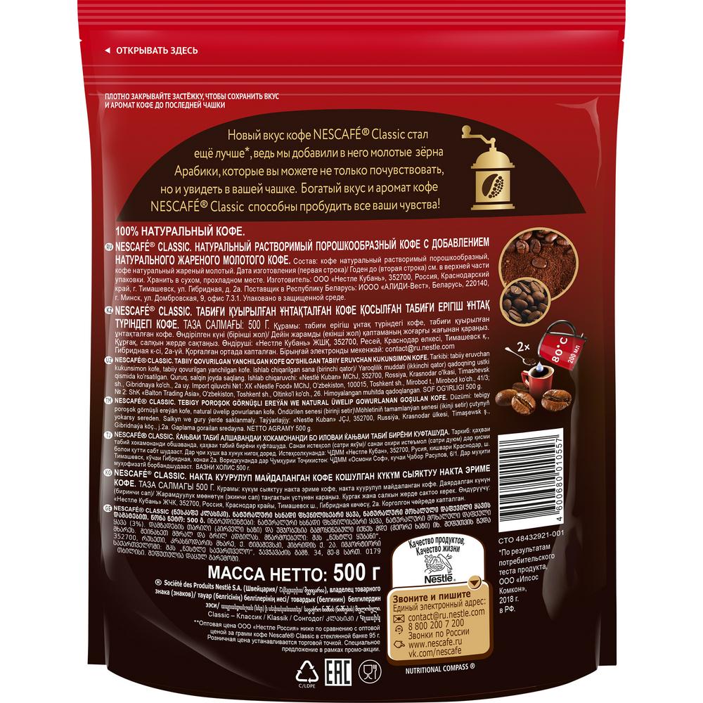 NESCAFÉ® CLASSIC, 100% натуральный растворимый порошкообразный кофе с добавлением натурального жареного молотого кофе, 500г, пакет