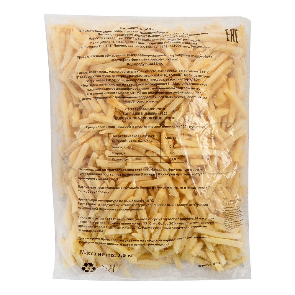 Картофель фри замороженный, нарезанный прямой соломкой. Диаметр сечения 9х9 мм