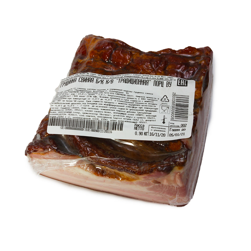 Мясной продукт из свинины копчено-вареные в порционной нарезке Грудинка свиная бескостная. Класс "Традициионная" Категории Г. Охлажденная ТУ