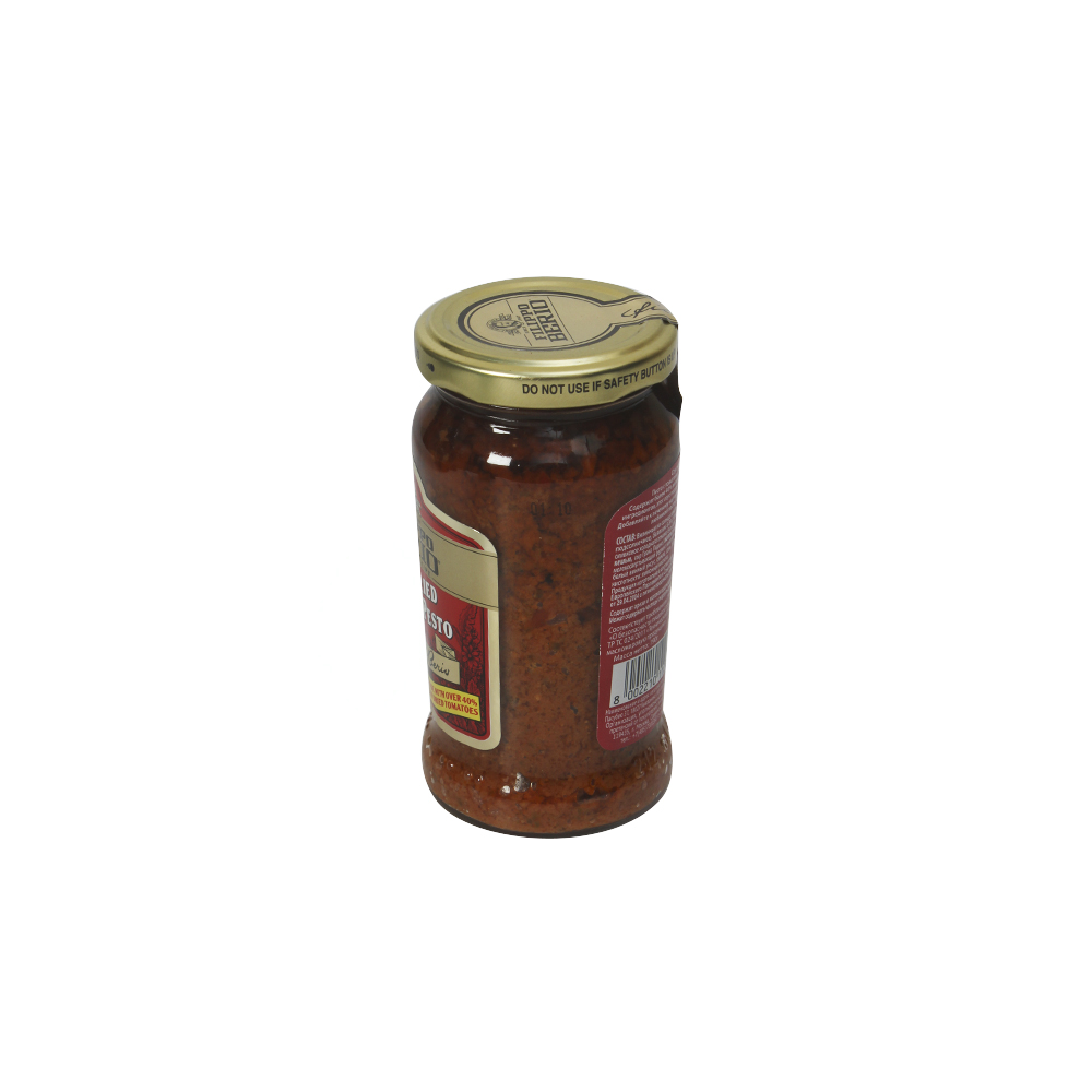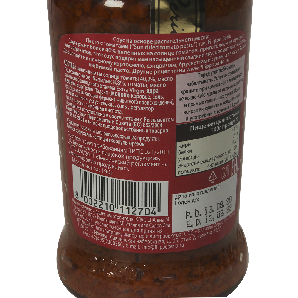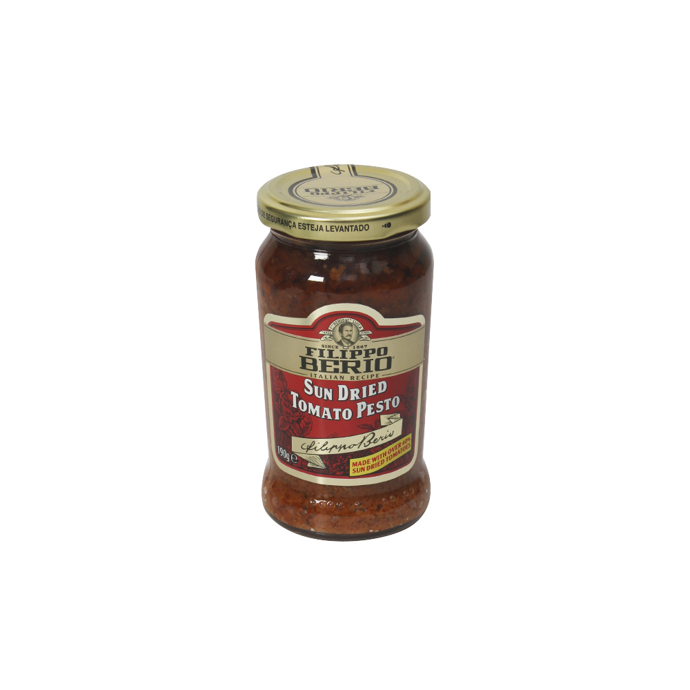 Приготовлен из вкуснейших вяленых помидоров и оливкового масла экстра вирджин (Extra Virgin) Filippo Berio. Используется в качестве соуса к спагетти или другому виду пасты и подается с тертым сыром "Пармезан". Используется также как сопровождение к блюдам из птицы, сэндвичам и рулетам. Соус "Песто" с вялеными помидорами используется для ароматизации картофеля в мундире и сэндвичей или просто для смазывания поджаренных ломтиков хлеба.