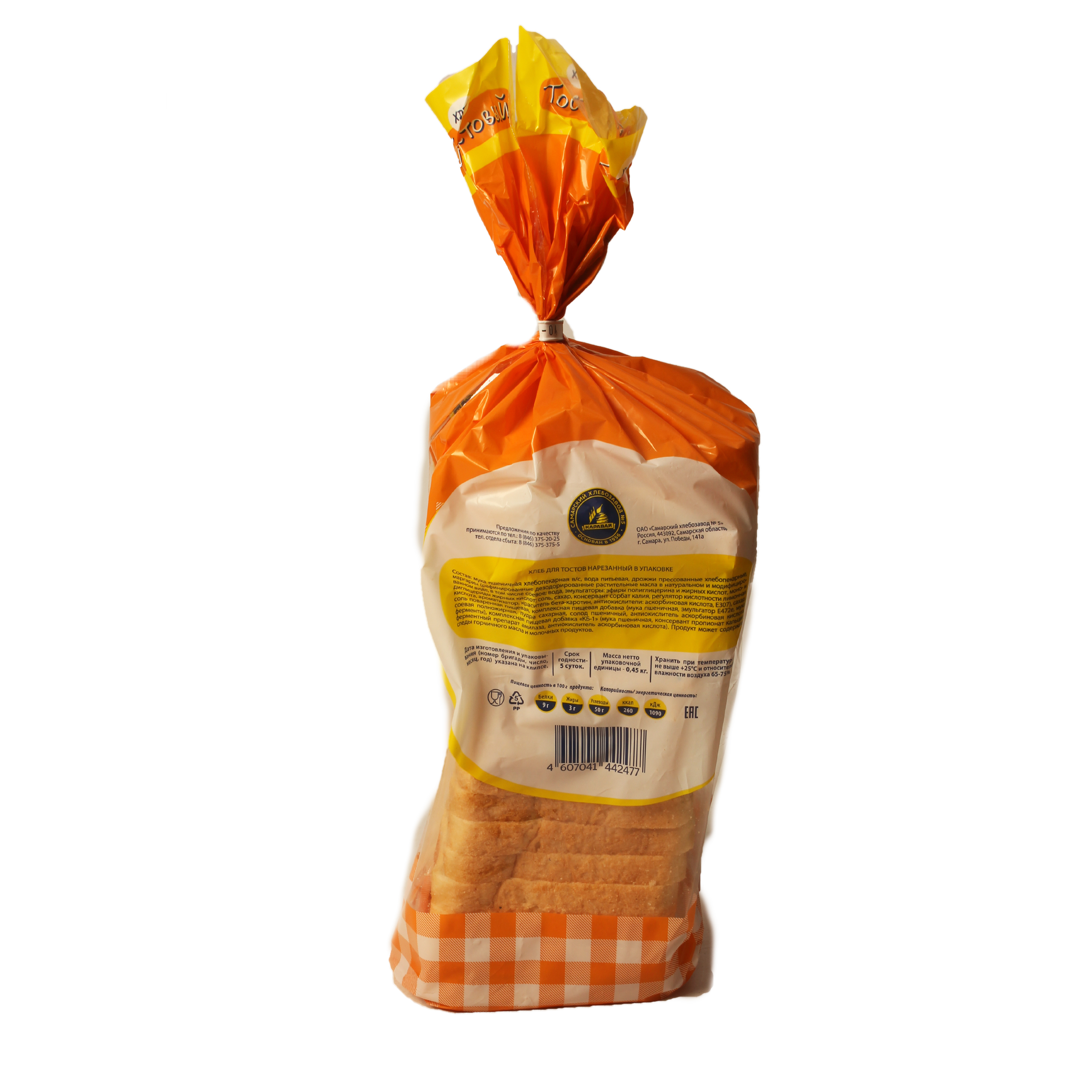 Хлеб для тостов нарезанный в упаковке. Энергетическая ценность- 260 ккал/ 1090 кДж