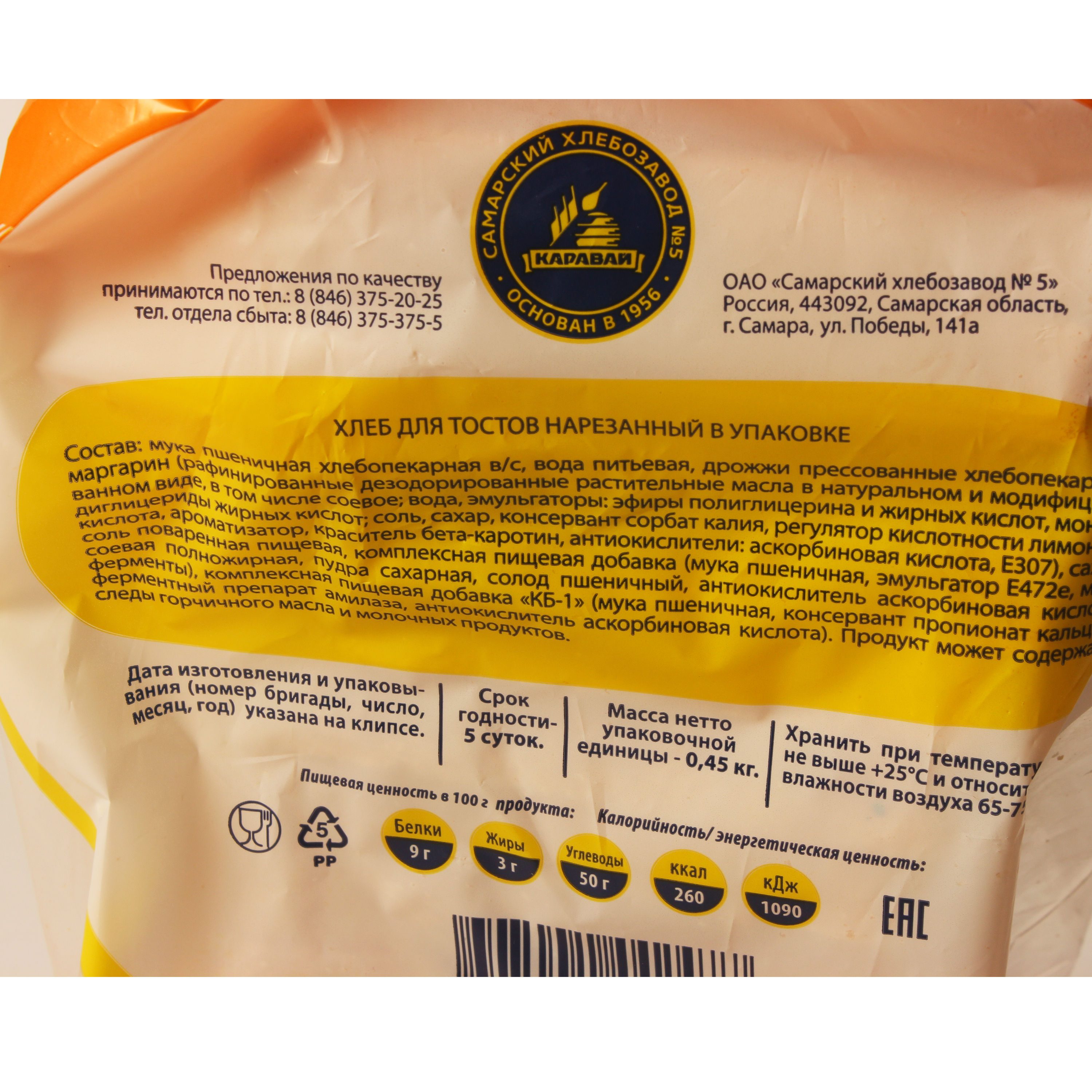 ХЛЕБ ТОСТОВЫЙ НАРЕЗКА СХЗ№5 450ГР