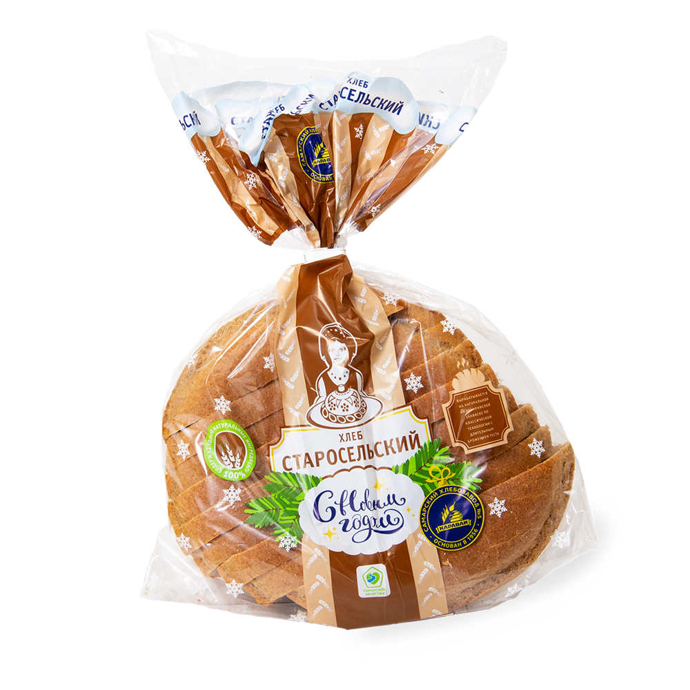 Хлеб старосельский формовой нарезанный в упаковке. Состав: мука ржаная хлебопекарная обдирная, мука пшеничная хлебопекарная первого сорта, вода питьевая, соль поваренная пищевая, дрожжи прессованные хлебопекарные