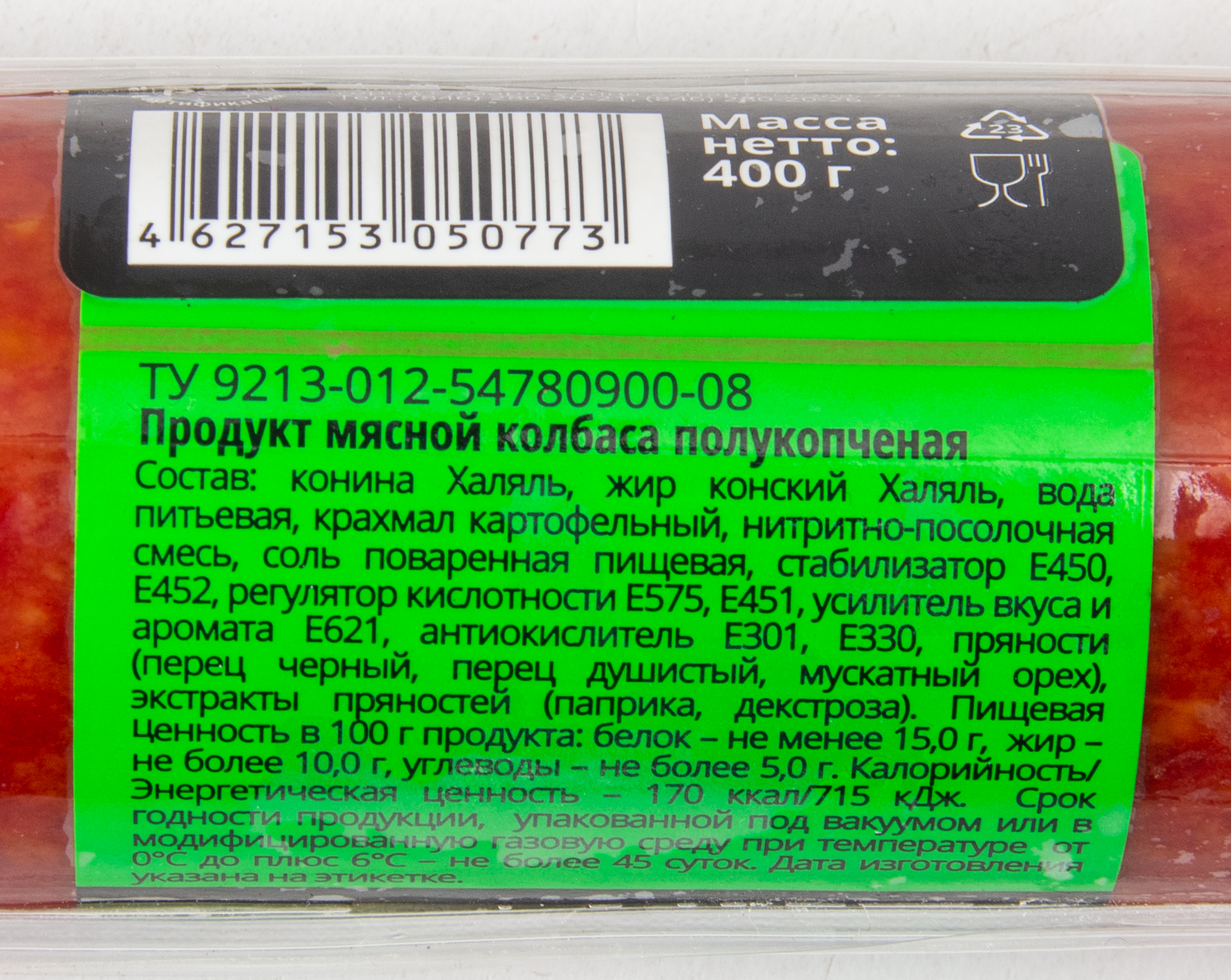 конина Халяль, мясо птицы Халяль, вода питьевая, нитритно-посолочная смесь (соль поваренная, фиксатор окраски –нитрит натрия), чеснок, регуляторы кислотности – трифосфаты, цитрат натрия, ацетат натрия, стабилизатор – пирофосфат, декстроза, глюкоза, усилитель вкуса и аромата – глутамат натрия, антиокислитель – изоаскорбиновая кислота, пиросульфит натрия, краситель красный рисовый, экстракты пряностей (перец черный, перец белый, кардамон, чеснок), ароматизатор.