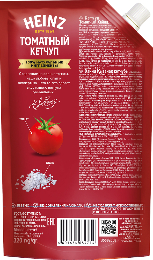 С 1876 года томатный кетчуп Heinz радует потребителей по всему миру превосходным вкусом и высочайшим качеством.Классический томатный кетчуп Heinz идеально дополнит практически любое блюдо и сделает его еще вкуснее.