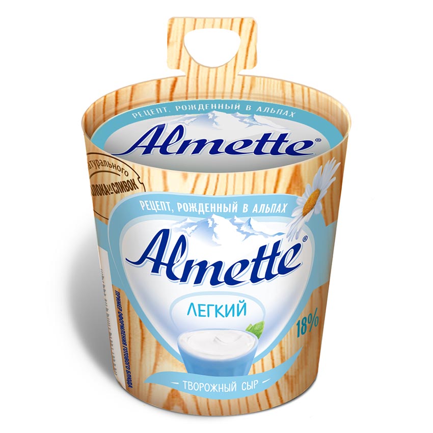 Almette Легкий – это нежное, воздушное удовольствие, которым можно баловать себя каждый день и не бояться потерять форму! Облегченный вариант классического творожного сыра идеально разнообразит полезный рацион и станет неотъемлемой частью питания сторонников здорового образа жизни. Almette Легкий изготовлен из свежего молока и натуральных сливок, со сниженным уровнем жирности (18%), уменьшенной калорийностью, при этом обладает изысканным сливочным вкусом.