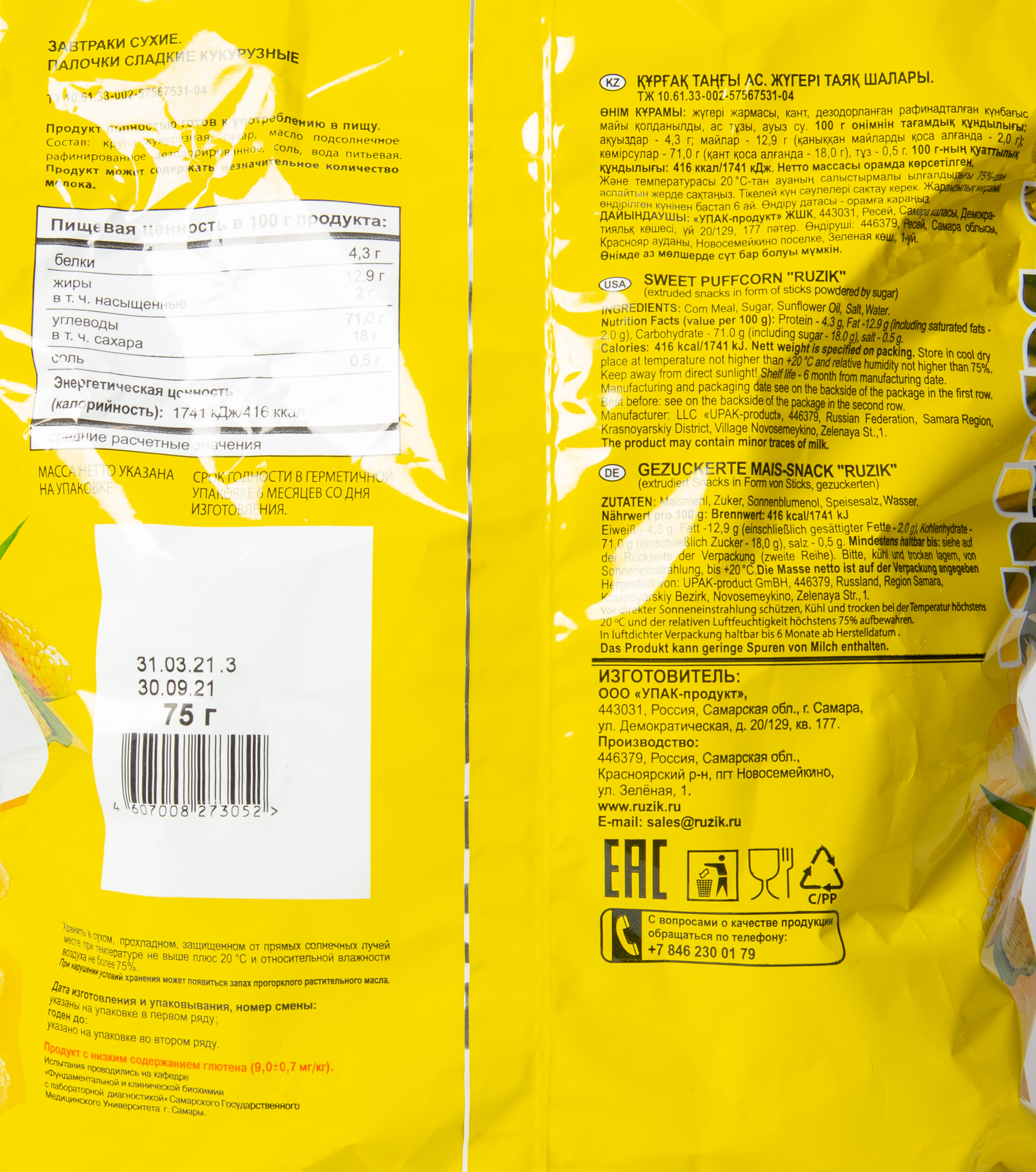 КУКУРУЗНЫЕ ПАЛОЧКИ РУЗИК 75ГР