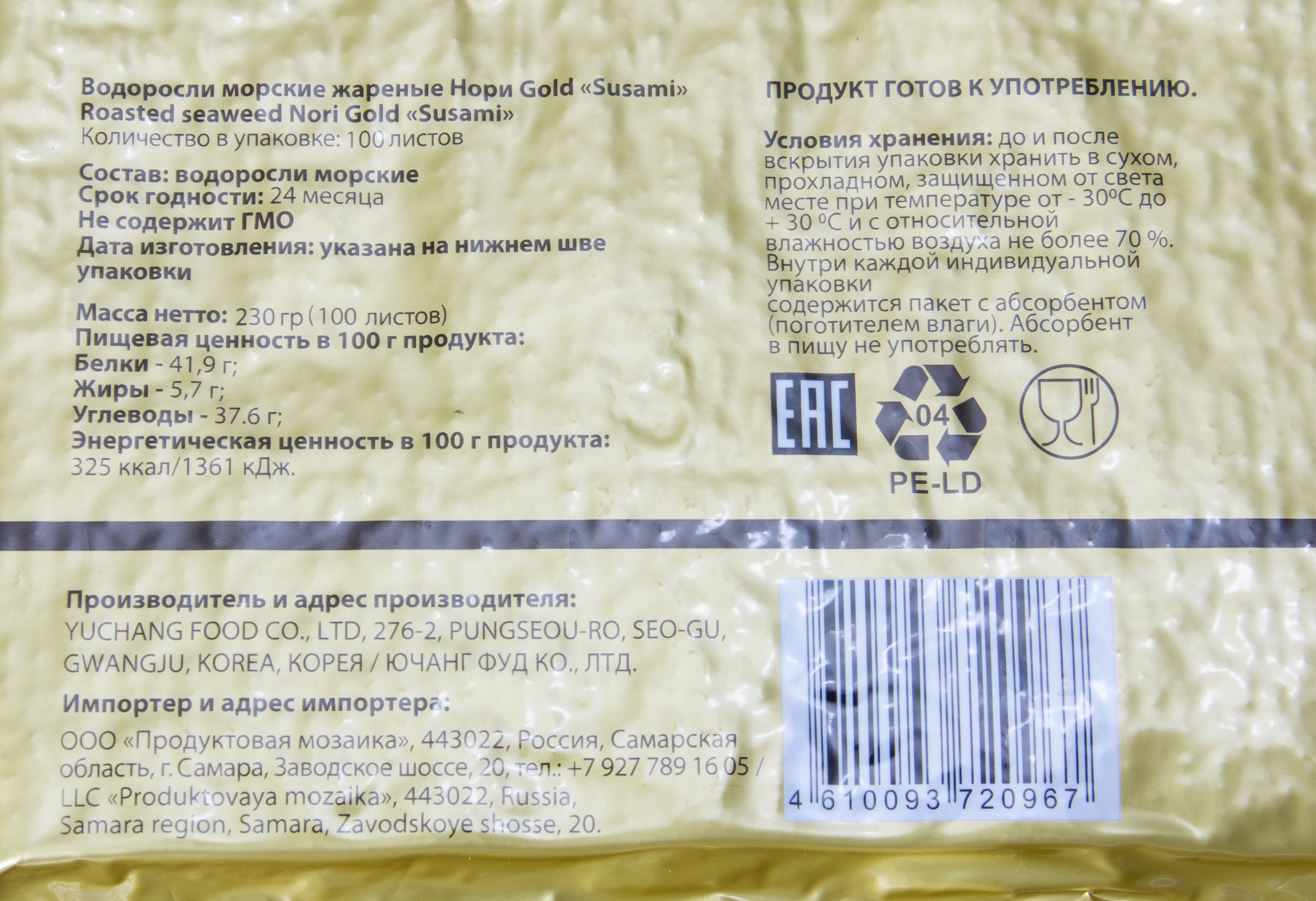 Водоросли морские жареные нори Gold SUSAMI. 100 листов в упаковке.
