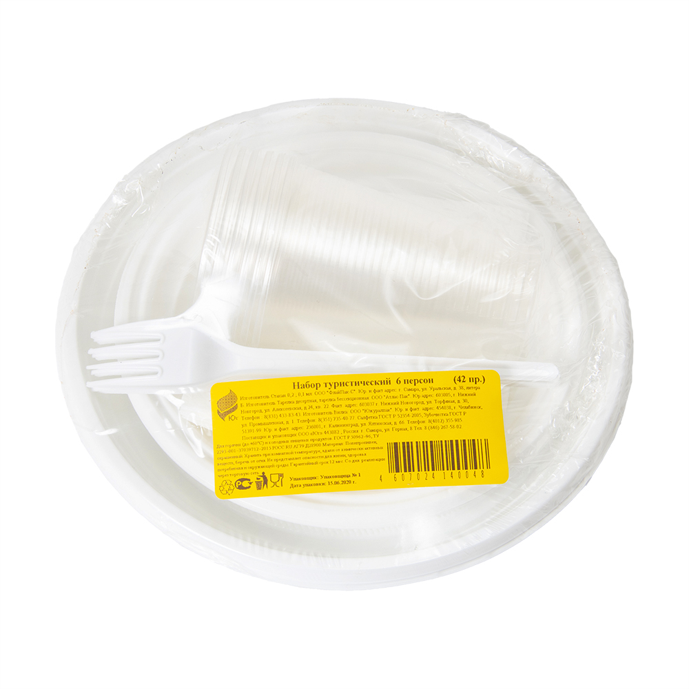 Набор туристический белого цвета включает по 6 штук: стакан 0,2, стакан 0,1, тарелка бессекционная, тарелка десертная, вилка, салфетка, зубочистка.
