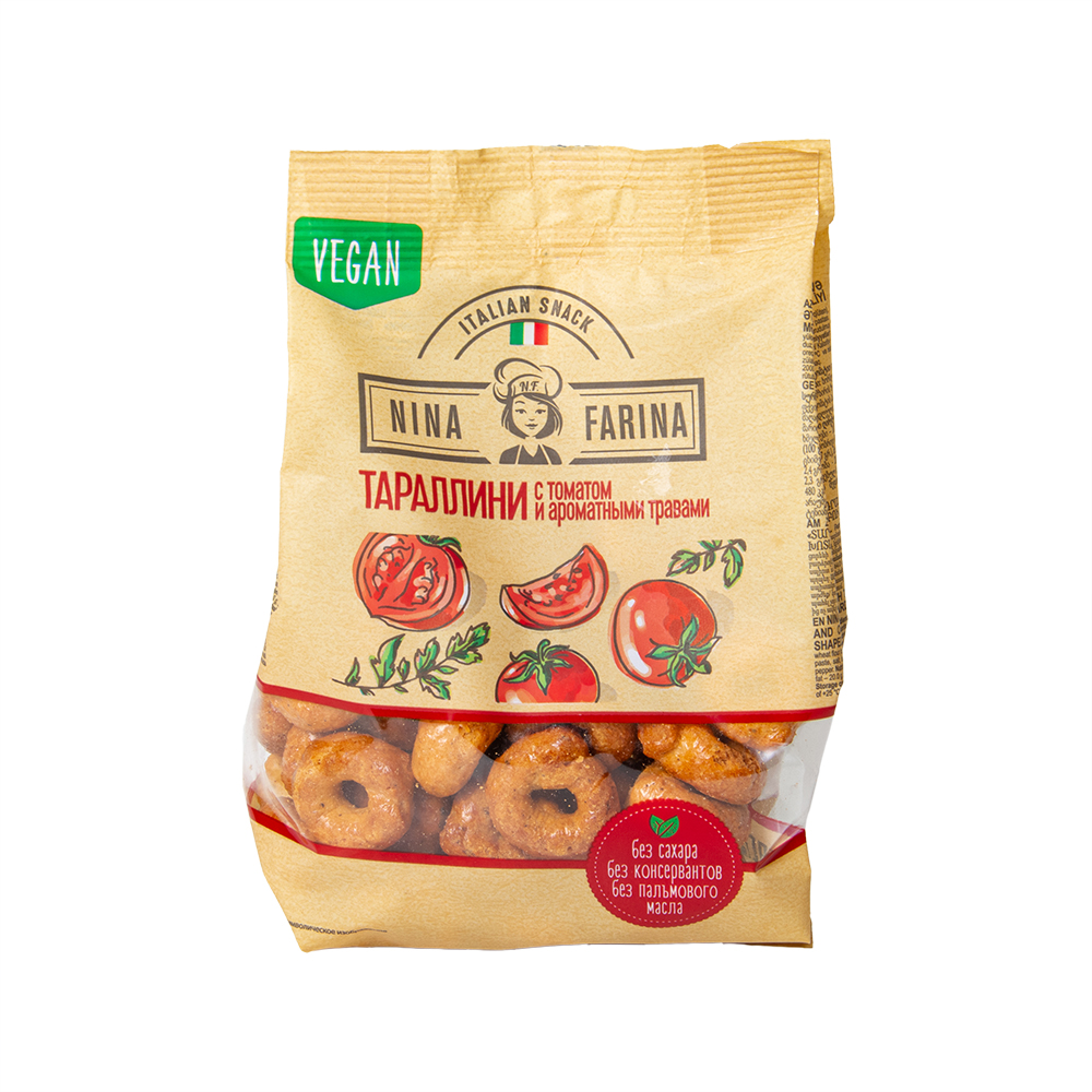В составе тараллини (итальянские сушки диаметром 25 мм) только натуральные ингредиенты: мука высшего сорта, подсоленная вода, высокоолеиновое подсолнечное масло, томатная паста и натуральные пряные травы.