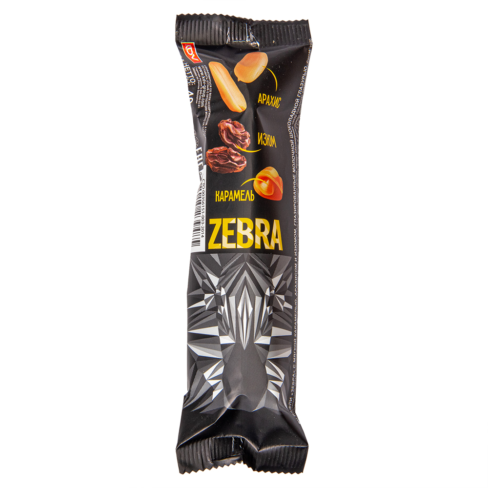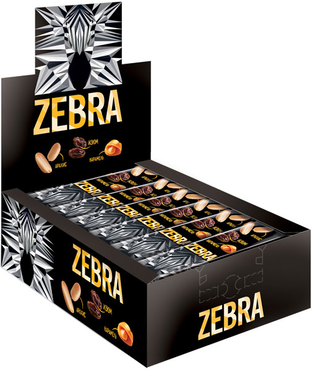 Многослойная вафля с богатой вкусовой палитрой Zebra / Зебра. Вафля с изюмом и арахисом в мягкой карамели, покрытая молочно-шоколадной глазурью