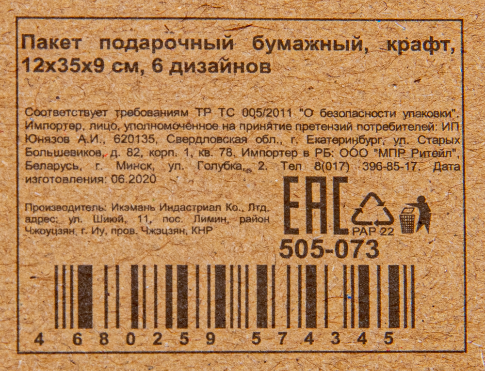 ПАКЕТ ПОДАРОЧНЫЙ 12/35/9 СМ КРАФТ