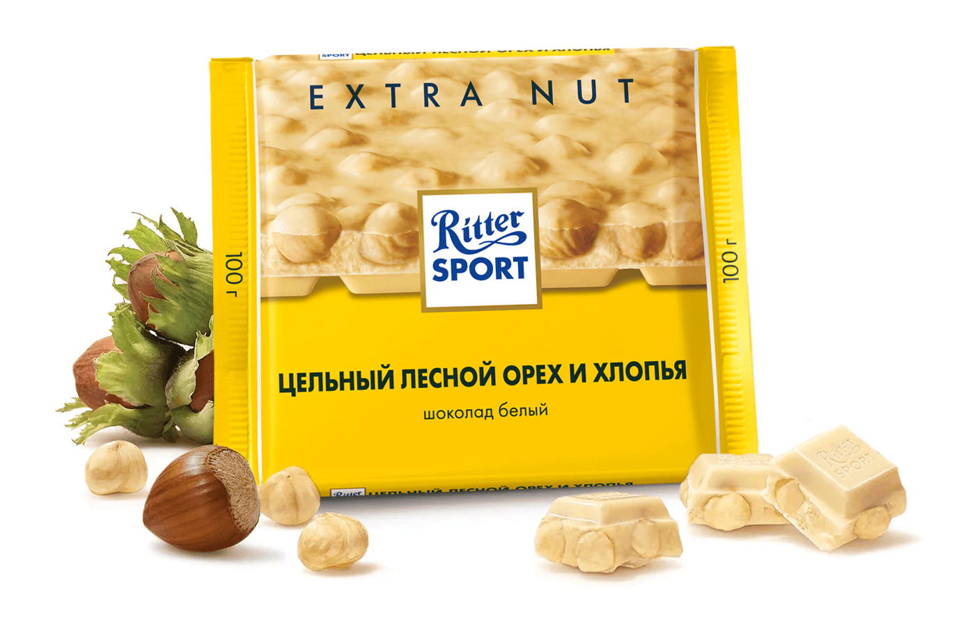 ШОКОЛАД РИТТЕР СПОРТ БЕЛ ШОК ЛЕСНОЙ ОРЕХ И ХЛОПЬЯ 100ГР