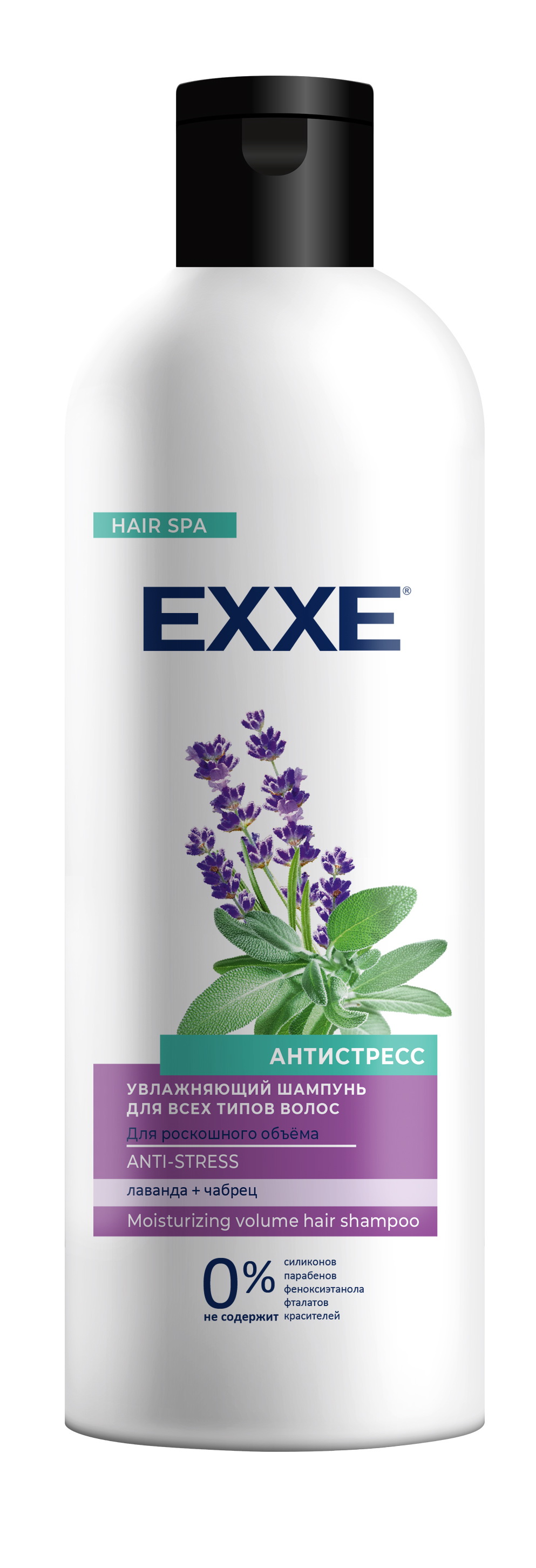 EXXE Антистресс увлажняющий шампунь для всех типов волос. Мягкая формула с пантенолом идеально подходит для ежедневного ухода за волосами и придания воздушного объема! Увлажняет, обеспечивает легкое расчёсывание и прикорневой объём, делает волосы послушными и гладкими. Экстракт календулы и аромат лаванды подарят антистресс эффект вашим волосам! Современная активная формула: натуральные растительные компоненты; без парабенов, силиконов и красителей; эффективный и комплексный уход за волосами и кожей головы.
