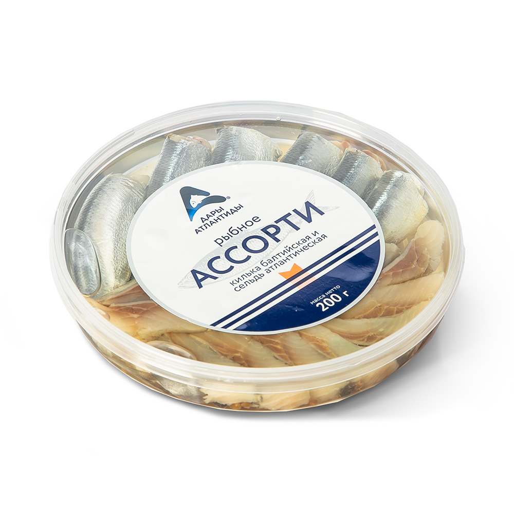 Рыбное ассорти это килька балтийская обезглавленная и нежнейшие кусочки-филе сельдь атлантическая засоленные в масле с пряностями