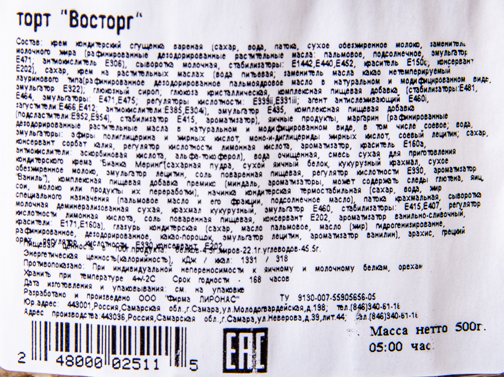 ТОРТ ВОСТОРГ ЛИРОНАС 500ГР