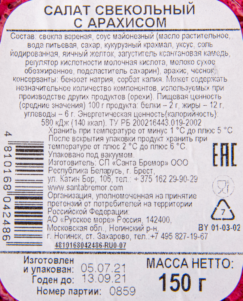 САЛАТ СВЕКОЛЬНЫЙ С АРАХИСОМ «САМОЕ ВРЕМЯ» 150Г (20%)