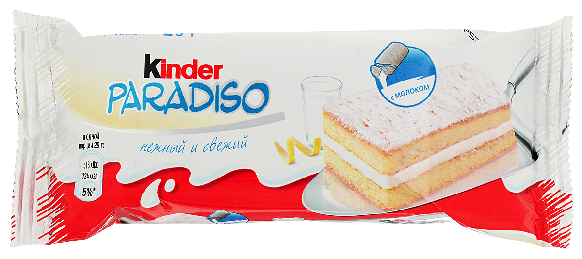 Киндер Парадизо – вкусный светлый бисквит с нежной молочной начинкой и вкусом лимона, посыпанной сахарной пудрой. Как и все молочные продукты, Kinder Paradiso нужно хранить в холодильнике. Не содержит красителей и консервантов.